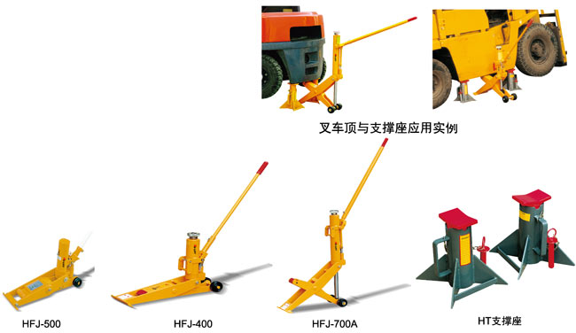● 專門用于叉車的維修.重型設計,結構新穎 ● 高品質油缸配置進口密封圈,安全耐用 ● HFJ-500具有快速起升功能,而且具有兩個工作面 ● HFJ-400和HFJ-700A具有低位一個工作面 ● 支撐座成對(2個)銷售 ● 與HT型支撐座配合使用,確保安全 ● 符合ANSI、CE安全標準