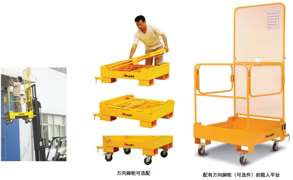 ● 載人平臺(tái)通過安全長(zhǎng)銷和和鏈條固定在貨叉上,確保不會(huì)滑動(dòng)