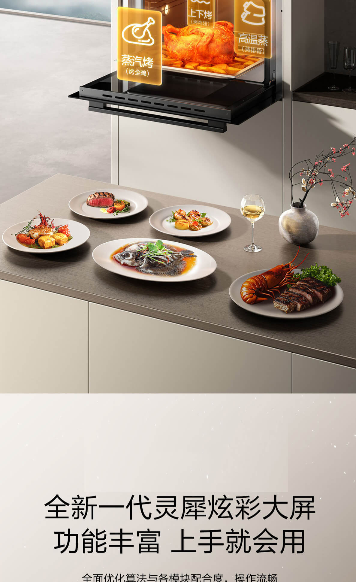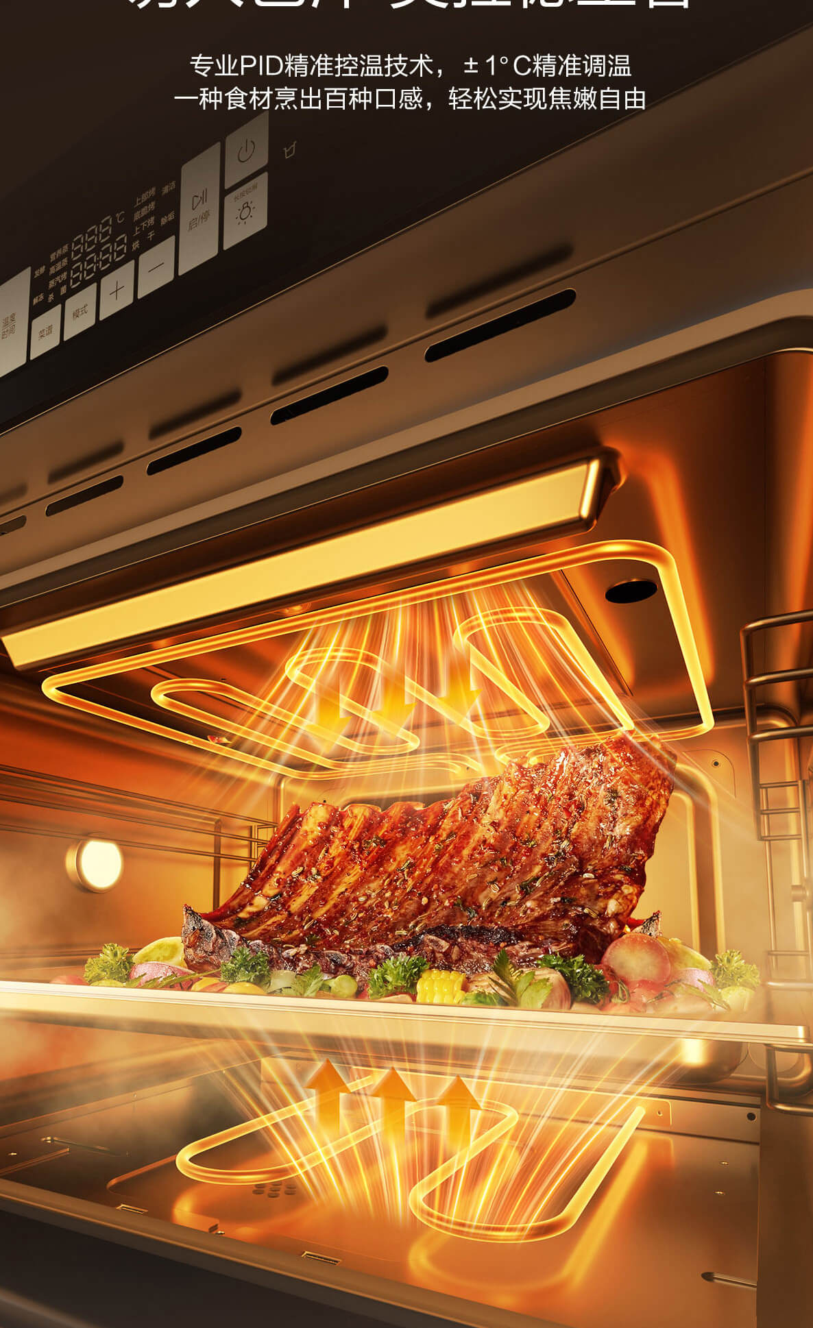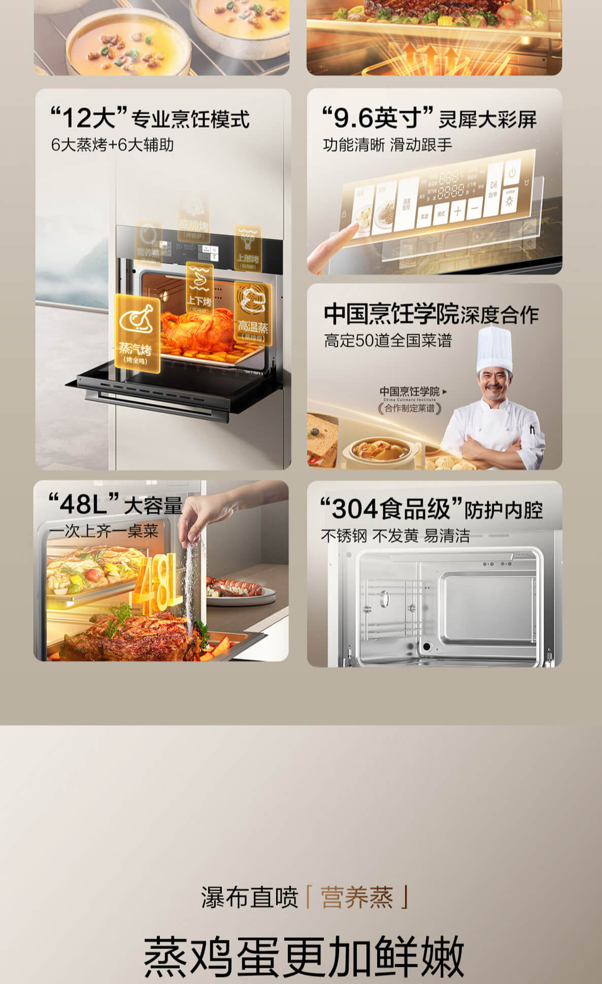 靈犀炫彩大屏,48L大容量,十二大專(zhuān)業(yè)蒸烤模式,上下雙管烤,直噴瀑布蒸汽,全304食品級(jí)不銹鋼,一鍵高溫殺菌