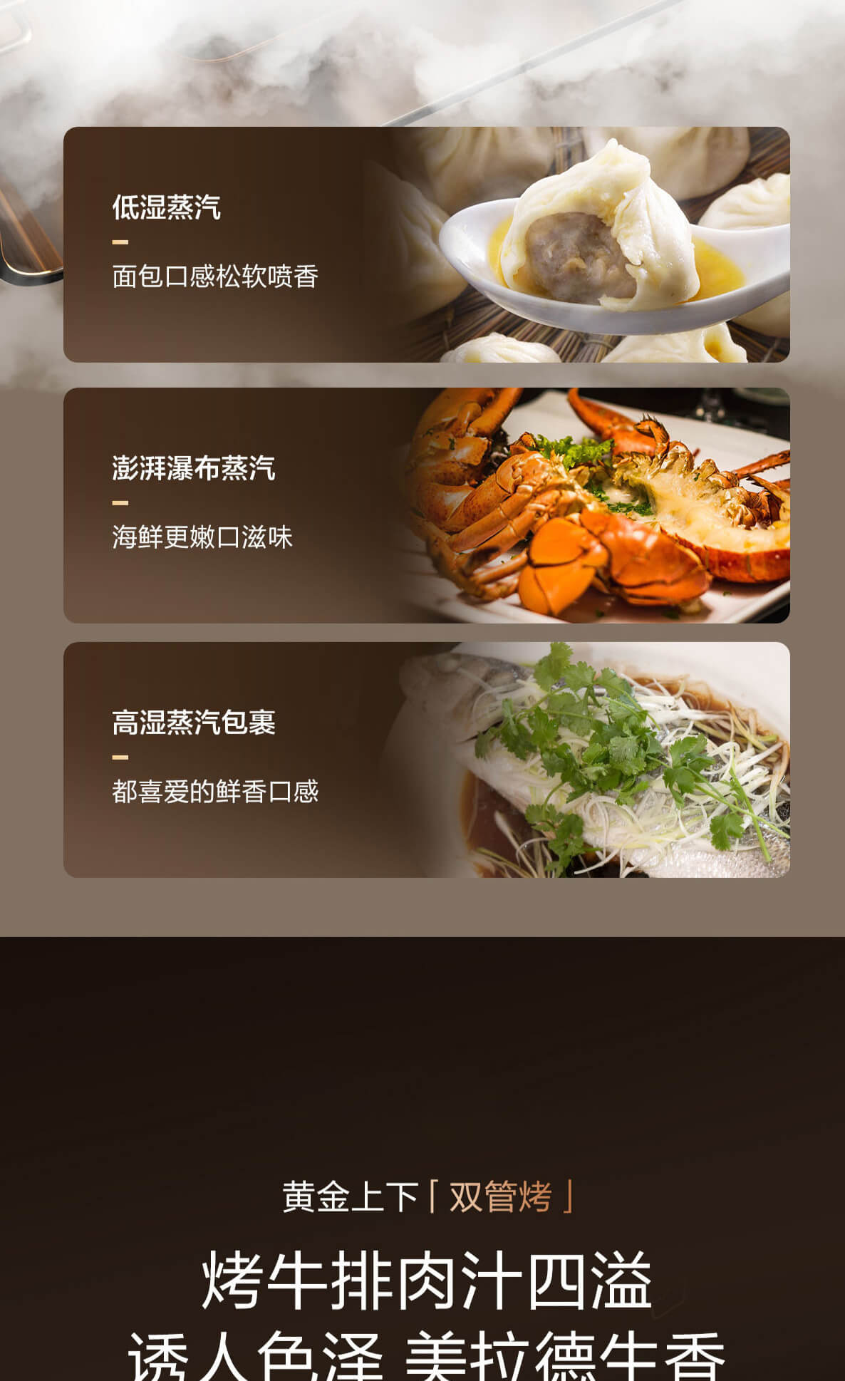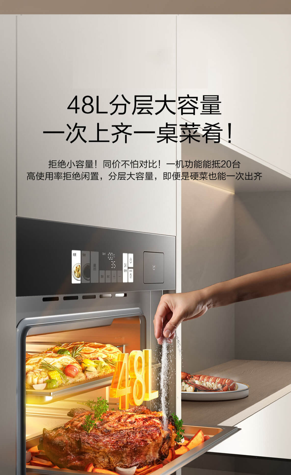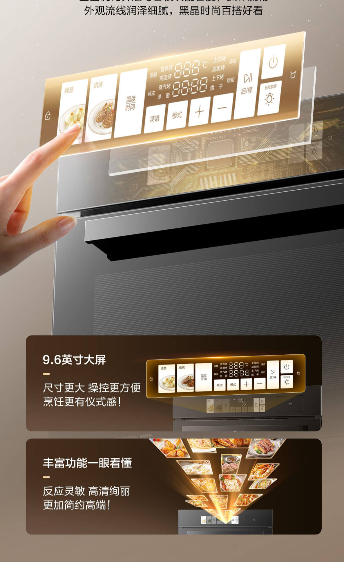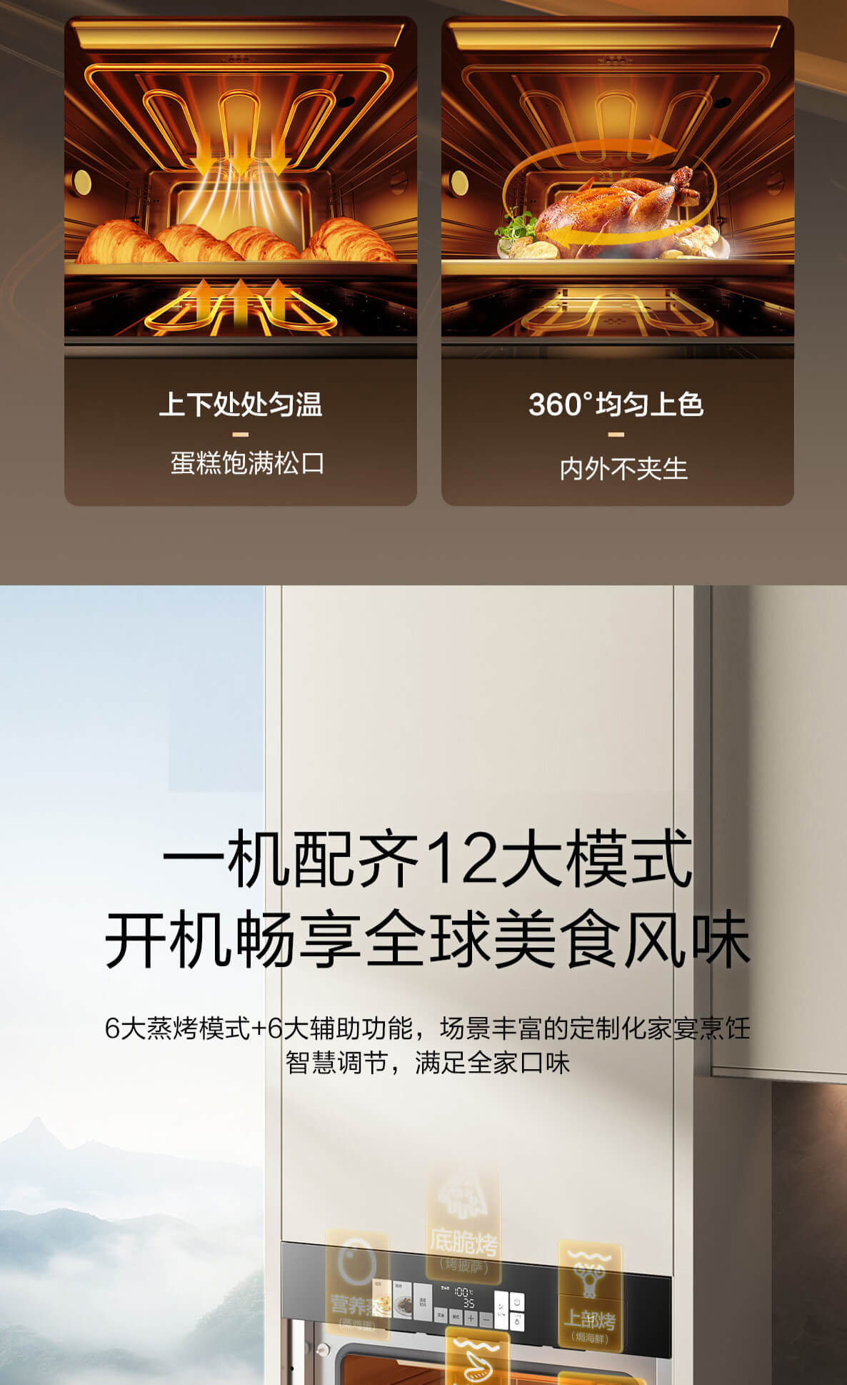 靈犀炫彩大屏,48L大容量,十二大專(zhuān)業(yè)蒸烤模式,上下雙管烤,直噴瀑布蒸汽,全304食品級(jí)不銹鋼,一鍵高溫殺菌