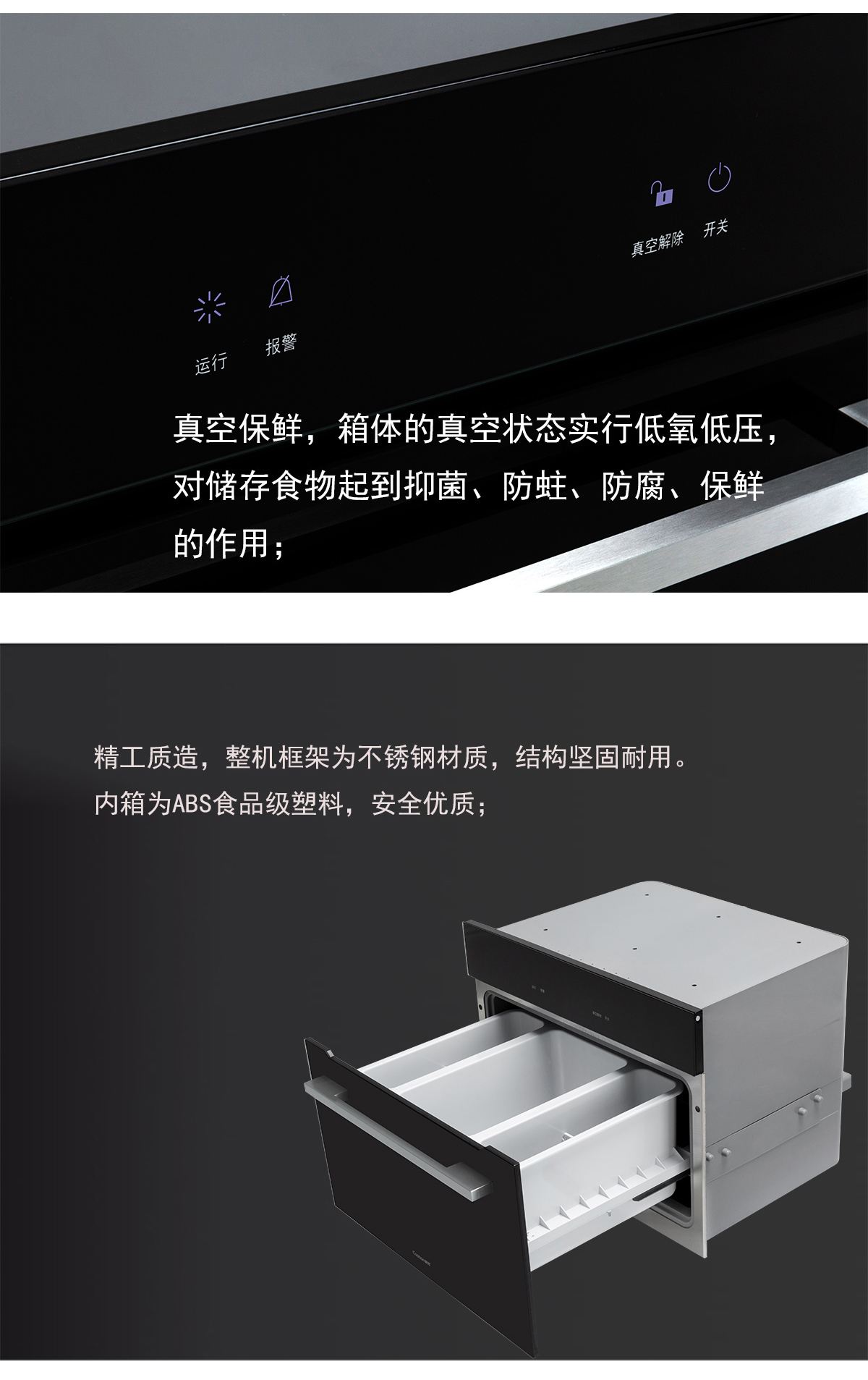 黑色鋼化玻璃面板;低氧低壓,真空保鮮;內(nèi)箱為ABS食品級(jí)塑料;